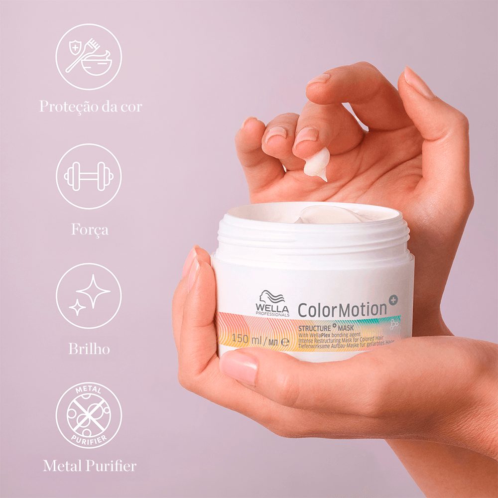 A Máscara Estruturante é um tratamento reconstrutor com tecnologia WellaPlex. Proporciona a reconstrução da estrutura capilar, deixando os fios mais fortes e brilhantes. Tenha o poder de 3 em seus cabelos: proteção da cor, brilho intenso e cabelos mais fortes! A linha Color Motion+ de Wella Professionals oferece até 8 semanas de proteção da cor e garante cabelos mais fortes da raíz às pontas! É indicada para os que se preocupam com o desbotamento da cor, mas precisam também do fortalecimento dos fios. A linha conta com tecnologia de proteção contra radicais livres, encapsulando metais e reduzindo a formação destes radicais, responsáveis pelo desbotamento da cor. Os produtos de Color Motion+ proporcionam o alinhamento da superfície dos fios, suavizando as cúticulas para melhorar o brilho e o toque do cabelo. Tenha cabelos muito mais fortes com Color Motion+ que utiliza a tecnologia presente em WellaPlex, ajudando a reconstruir as ligações internas dos fios para um cabelo mais forte! É o tratamento perfeito para cabelos coloridos e com danos.