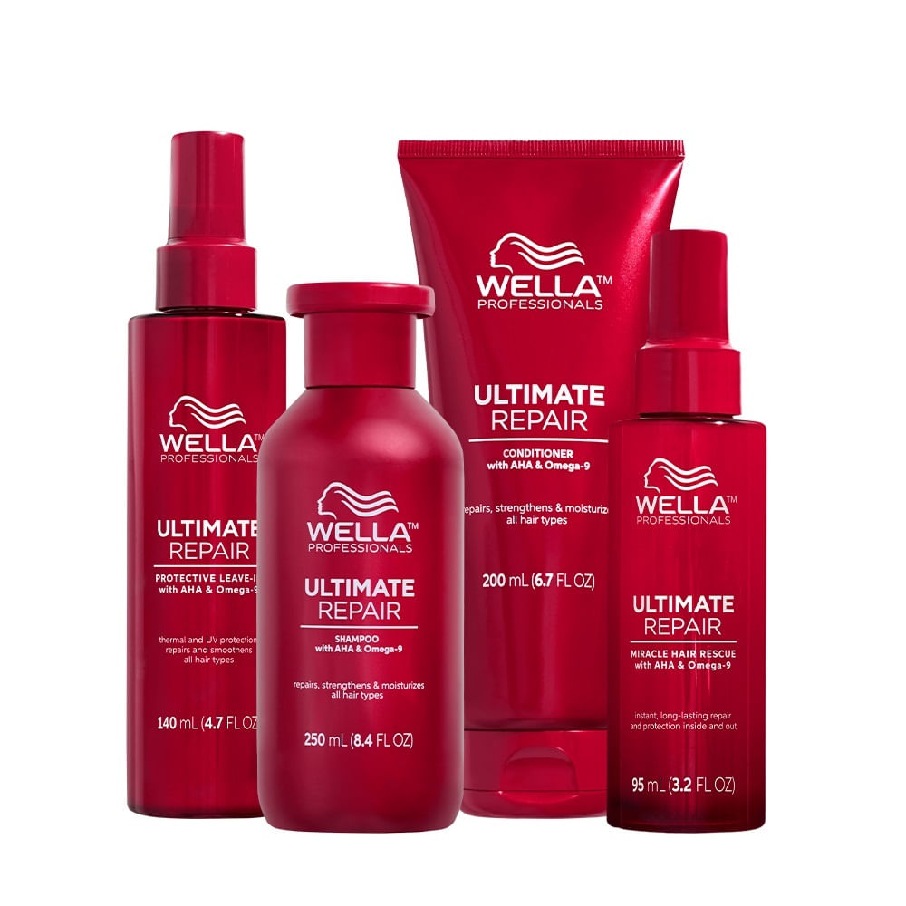 O Kit Completo Wella Ultimate Repair Com Miracle Hair Rescue 95ml contém 1 Shampoo Wella Ultimate Repair 250ml, 1 Condicionador Wella Ultimate Repair 200ml, 1 Wella Ultimate Repair Miracle Hair Rescue 95ml e 1 Wella Ultimate Repair Leave-In Protetor 140ml