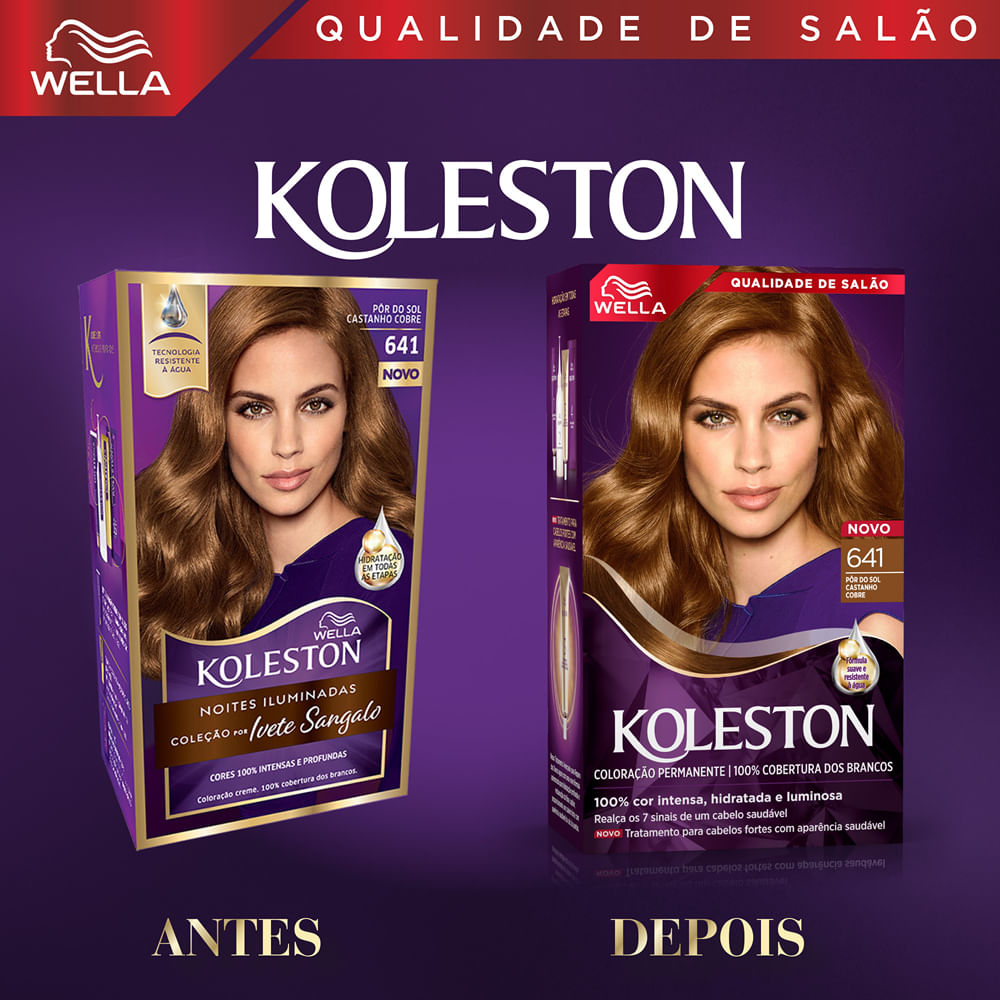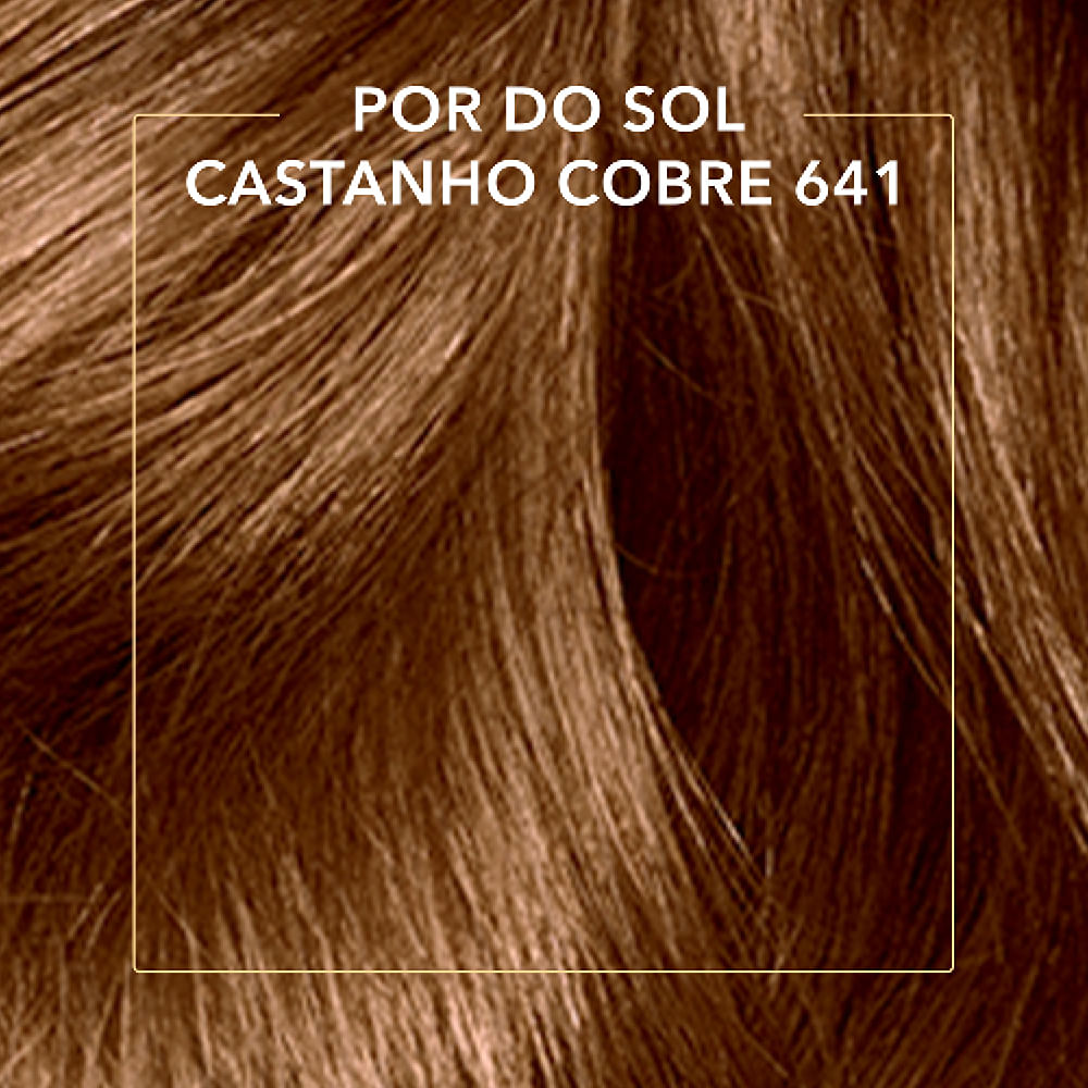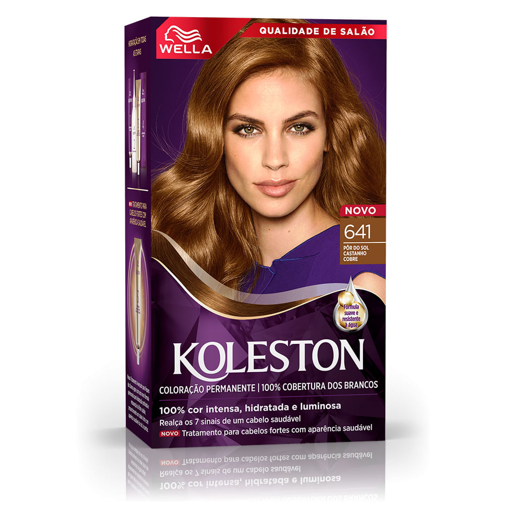 Tinta de Cabelo Koleston Pôr do Sol Castanho Cobre 641 se inspirou nos tons do pôr do sol ao amanhecer para desenvolver suas cores preferidas para Koleston. Sua fórmula possui o exclusivo Tratamento Gloss Intenso que atua como uma barreira de proteção no cabelo para deixa-lo com mais brilho e maciez, ajudando a manter a intensidade da cor. Além disso, o kit conta também com o Reativador de Cor que deposita mais pigmentos no seu cabelo para ajudar a reaver a cor, depois de 15 dias da aplicação da tintura.